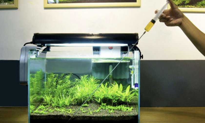При покупке растений и рыбок удобрения вносят с первого дня. В них обязательно должен быть азот, фосфор и калий (макронутриенты). Некоторые водоросли требуют магния, серы, марганца, бора (микронутриенты). Они выпускаются в жидком и твердом виде. Первые подходят для плавающих растений, не обладающих корнями. Для зелени, растущей из грунта, рекомендованы твердые удобрения. В случаях, когда в аквариуме есть разные растения, вносят подкормки обоих видов. Общую дозу средств разделяют на два.