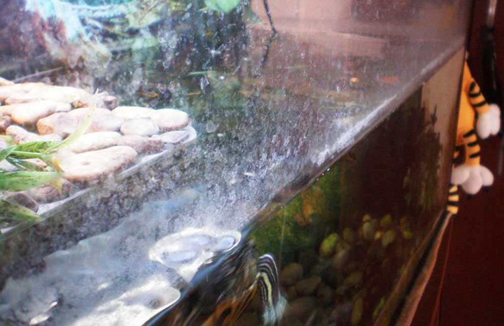 В результате испарения на стенах аквариума образуется сильный налет, который еще и является источником неприятного запаха.