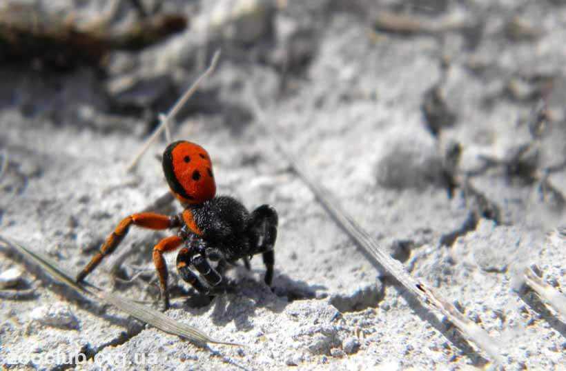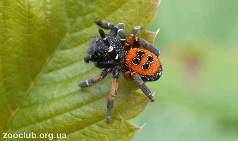 У самцов головогрудь окрашена в черный цвет и покрыта густыми волосками, а абдомен ярко-красный, алый или оранжевый. На нем заметны 4 черных круглых пятна. У большинства подвидов они окаймлены белой каемкой. На двух передних лапах заметны беловатые кольца, а на двух задних красноватые.
