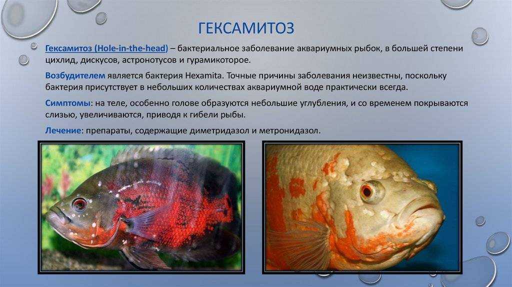 - Гексамитоз.Сопровождается расширением пор в районе головы и боковой линии, отсутствие аппетита и истощением рыбы. Лечится метронидазолом. В запущенной стадии приводит к смерти питомца.