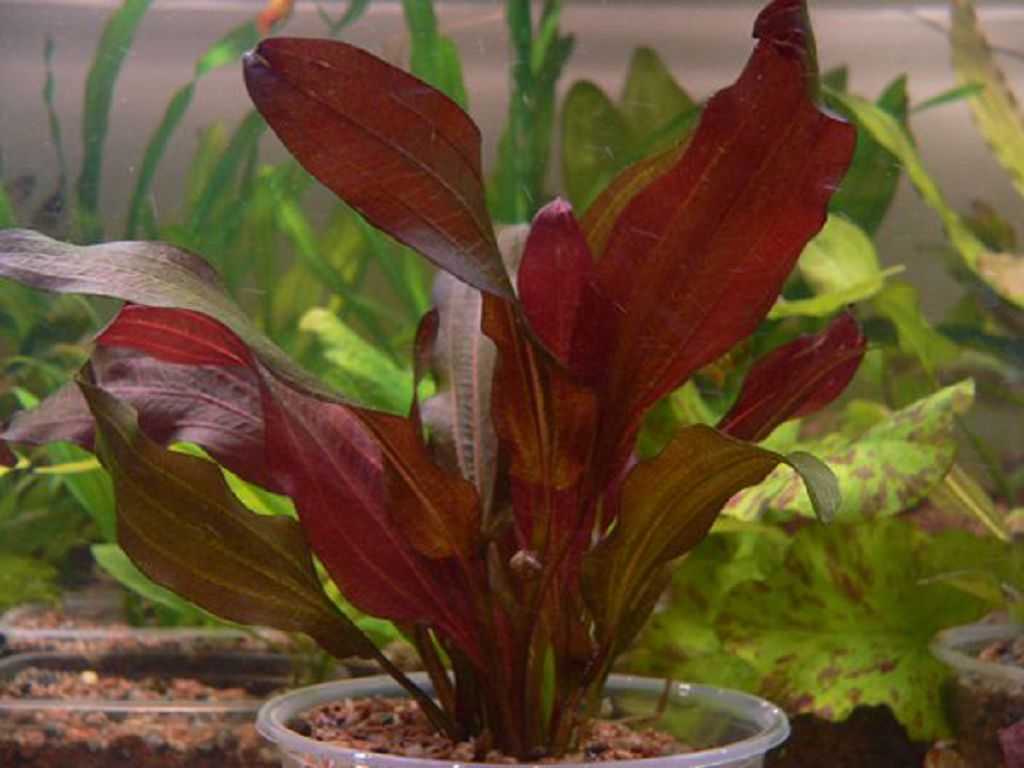 Это раскидистый куст, вырастающий в аквариуме до 50 см. Листья у него жесткие, с видимыми прожилками. У молодых растений они красного цвета, у старых – зеленого.
