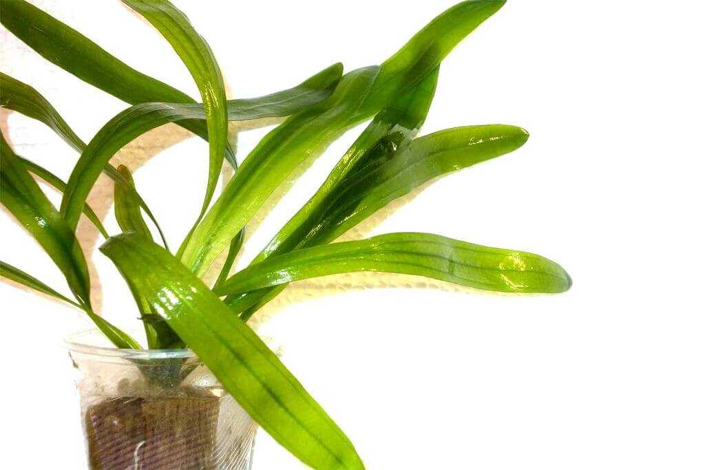 Корневая система растения мочковатая, хорошо развитая. Стебель у него прямой и короткий. Листья лентовидные, длиной до 45 см. На рынке этот эхинодорус почти не найти, потому что он сложно размножается.
