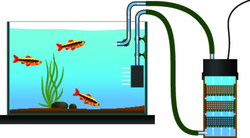 Некоторые обладатели аквариумов предпочитают внешние фильтры. Само устройство (аквариумисты называют его ведро) располагается с внешней стороны рядом с ёмкостью, а в водную среду опускают две трубки для откачки грязной воды и закачки чистой после фильтрации.