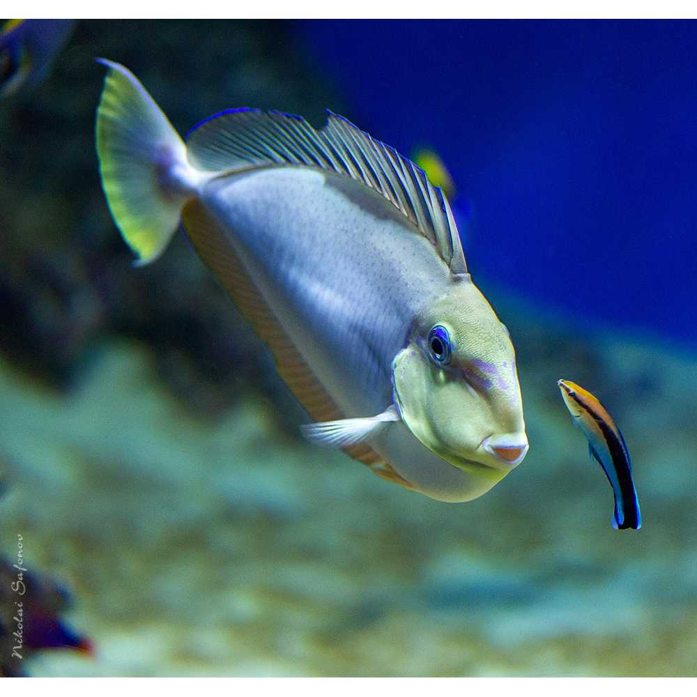 - Акатур Левкостернон или голубая теневая рыба-хирург. Он имеет те же цвета, что и предыдущий, но на этот раз верхний плавник желтый.