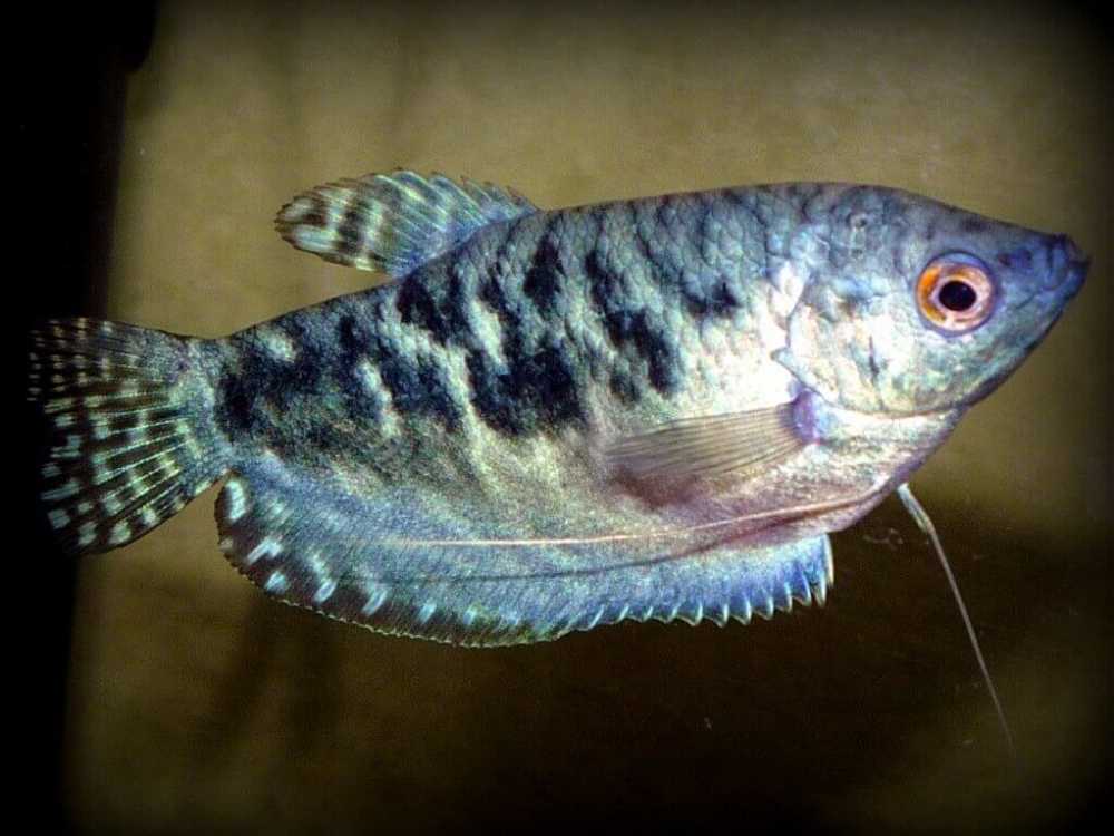 Описание: Гурами мраморный – это мутация голубого гурами, искусственная селекционная форма гурами голубого. Крупная рыбка. Особи вида гурами мраморный в длину могут достигать 13 см. Тело овальное, высокое, сжато с боков. Брюшные плавники длинные, нитевидные. Анальный плавник широкий. Окраска тела мраморный: на светло-сером фоне расположены темные серые пятна неправильной формы. Анальный, спинной и хвостовой плавники темно-серые, в многочисленных желтых пятнышках. Грудные плавники прозрачные, бесцветные. Самец отличается от самки более узким телом, яркой окраской с удлиненными, более заостренными спинным и анальным плавниками.
