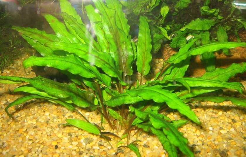 - Курчавая криптокорина имеет нехарактерную для растения мощную корневую систему. Стебель короткий. Листики длинные, волнистые, вырастают более полуметра. Торчащую из воды верхушку подстригают, чтобы листья не потеряли оригинальной формы.