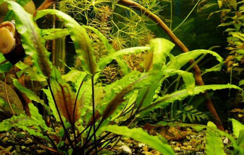 - Обратноспиральную криптокорину можно вырастить до 50 см. Длинные узкие листики извилистой формы могут быть окрашены в любой оттенок зелёного в зависимости от света. Желательна умеренная подсветка.