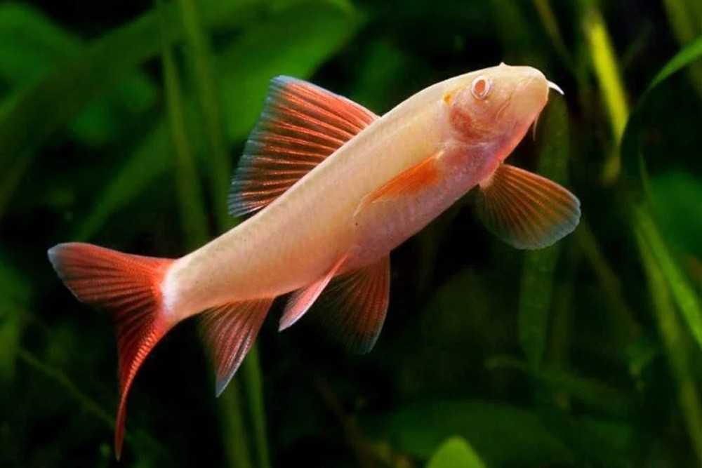 Лабео альбинос относится к разновидности зеленых рыбок. Имеет яркие красные плавники с коричневым оттенком. Тело полностью белое. Глаза альбиноса в тон красно-коричневым плавникам.