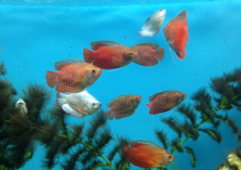 - Colisa lalia – лялиусы, имеющие радужную голубую окраску, с красными и зеленовато-синими полосочками. У самцов полосы гораздо ярче, чем у самок. Размер особей не превышает 6 см, украшением служат продолговатые, удлиненные плавники – спинной и анальный. У самочек плавники закругленные. В условиях искусственного водоема при хорошем уходе Colisa lalia живут от 4-х до 5 лет.