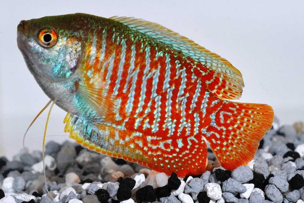Маленькая лабиринтовая рыбка, способная украсить любой тропический аквариум. У лялиуса четко проявляется половой диморфизм: самки с точки зрения красоты ценности не представляют (как и большинства других видов), а вот самцы без внимания никогда не останутся. Их серебристое тело покрыто красными и голубыми светящимися полосками (хотя есть селекционные формы с другими вариантами окраса). В ходе эволюции грудные плавники превратились в тонкие чувствительные нити.