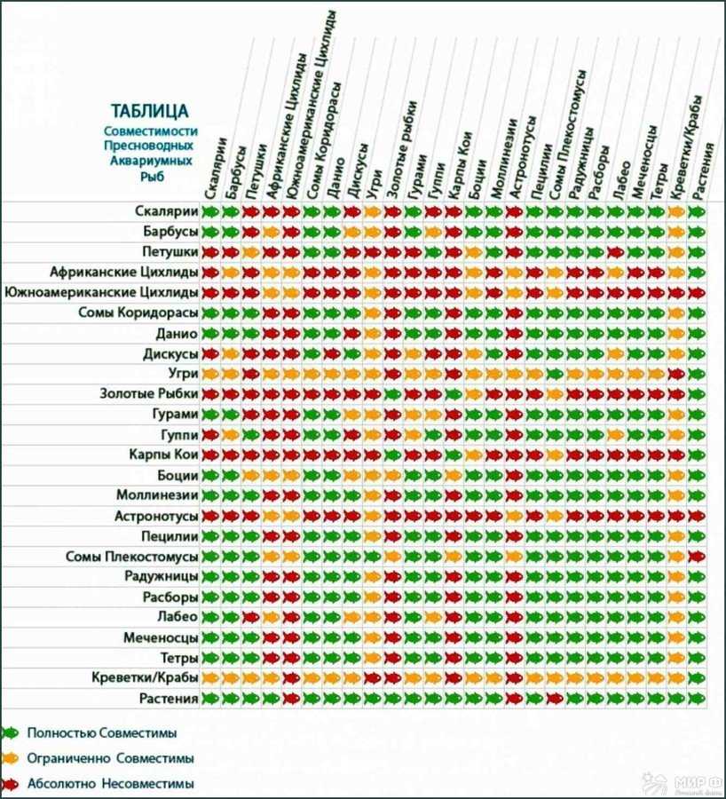 Справиться с задачей подбора рыбок и других обитателей аквариума поможет таблица совместимости (таблица). С ее помощью вы сможете правильно заселить аквариум, правильно подобрав обитателей.