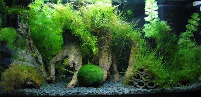 Интересен также вариант прикрепления мха к вершинам вертикальных элементов коряг. Такой декор на дне аквариума напоминает деревья с пышной кроной. С боковой подсветкой смотрится великолепно!