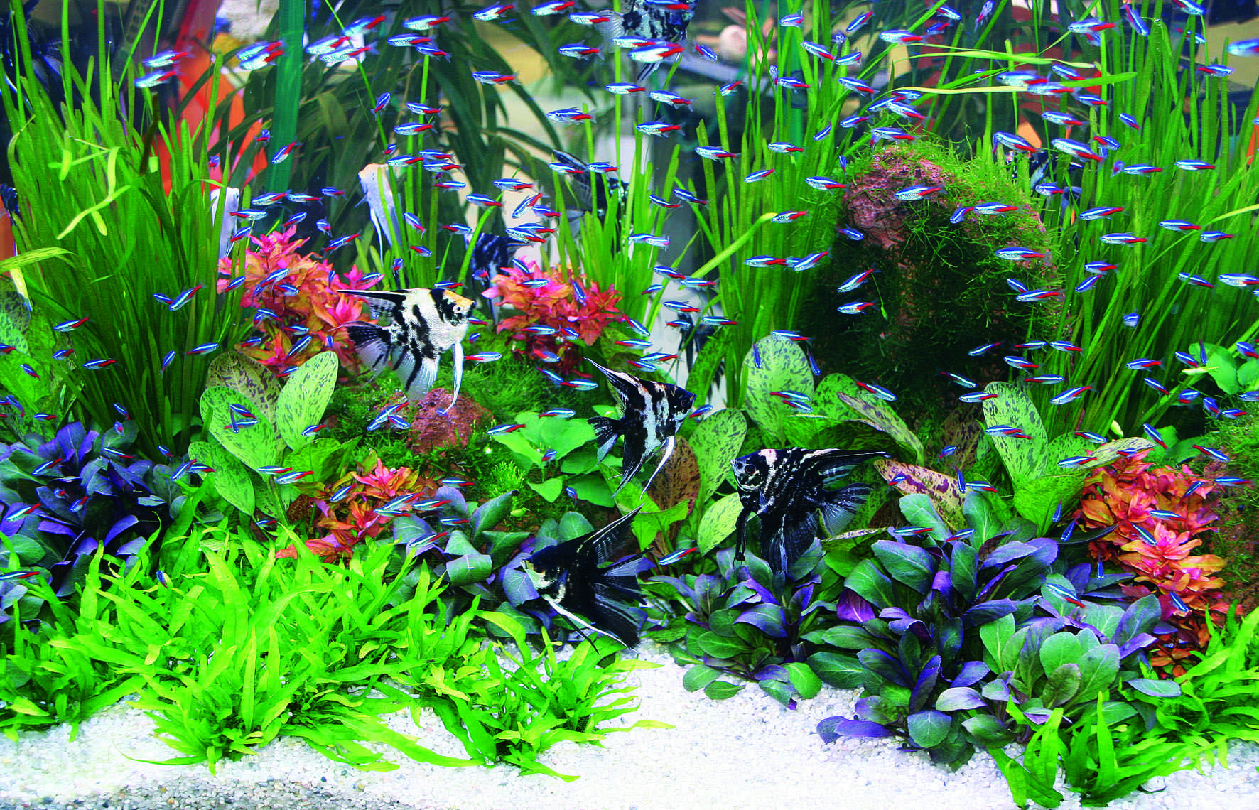 В больших аквариумах неоны также отлично себя чувствуют. Благодаря своей яркой окраске они не теряются на фоне пышной зелени и хорошо гармонируют практически с любым дизайном.