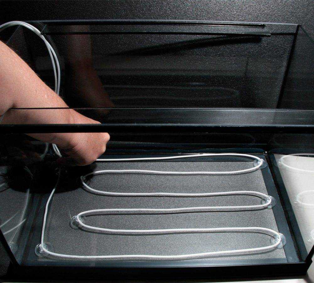 - Донные. Подходят для больших резервуаров. Представляют собой нагревательный кабель, который укладывают зигзагообразно на дно емкости под грунт. Рекомендуется дополнительно использовать устройство проточного или погружного типа.