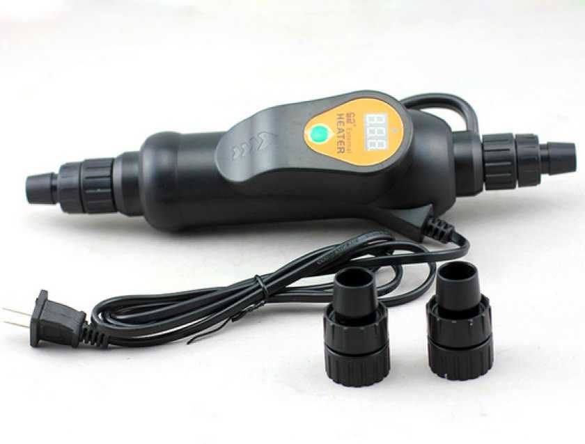Проточный нагреватель выполнен из пластика. Он крепится вертикально к шлангу внешнего фильтра. Когда поток проходит через него, вода нагревается, и экономится место в аквариуме, но, при этом, идет значительное потребление электроэнергии.