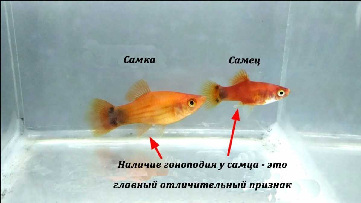 Пецилии являются живородящими рыбками и, как и у всех живородок, у них ярко выражены половые признаки. Самки отличаются менее красочной окраской и более крупными размерами, их брюшко более округлое