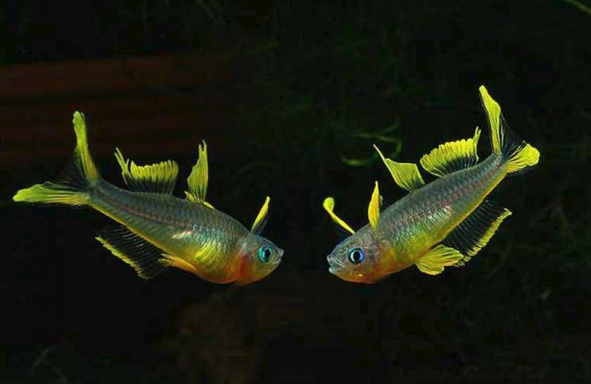Все плавники у самцов имеют желтую окантовку, у самочек брюшные и грудные плавники практически не окрашены, прозрачные. Отличить рыбок может быть сложно только в совсем юном возрасте, когда самцы еще не в полной мере демонстрируют свою красоту. Приглядеться нужно к грудным плавникам – на них заметить проявления окраски будет проще всего. Держать рыбок лучше всего группой от 6 штук или посадить одного самца и пару самочек. По своему опыту я заметила, что один самец затерроризирует другого, если их будет всего двое и размер аквариума будет менее 100 литров.