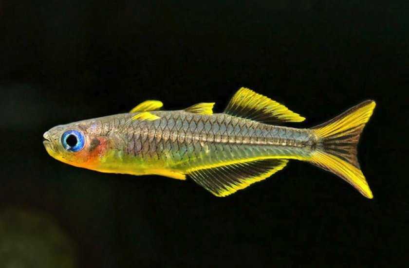 В яркий жёлтый цвет, перемежаемый узкими чёрными полосками, окрашены и разной длины края хвоста, в середине которого располагается треугольник коричневатого оттенка. Чрезвычайно выделяют эту рыбку ярко-голубые глазные обводы вокруг зрачка.