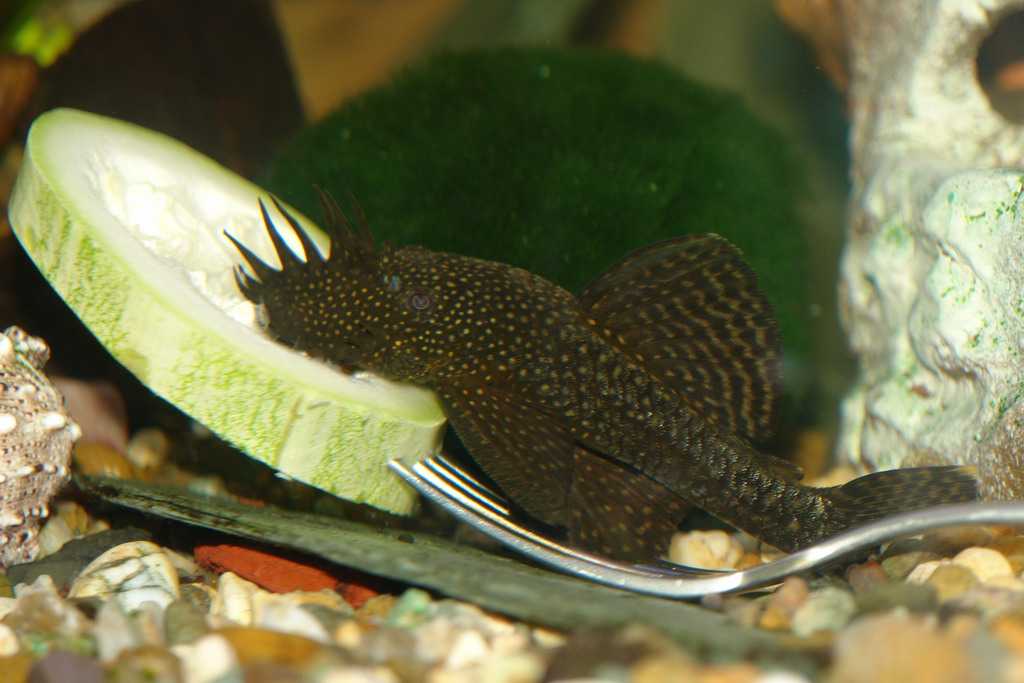 Из растений можно давать морковку, огурец, кабачок, листовую зелень. Можно купить в зоомагазине готовый растительный корм. Животную пищу дают преимущественно замороженную, из живых кормов используются креветки, мотыль.