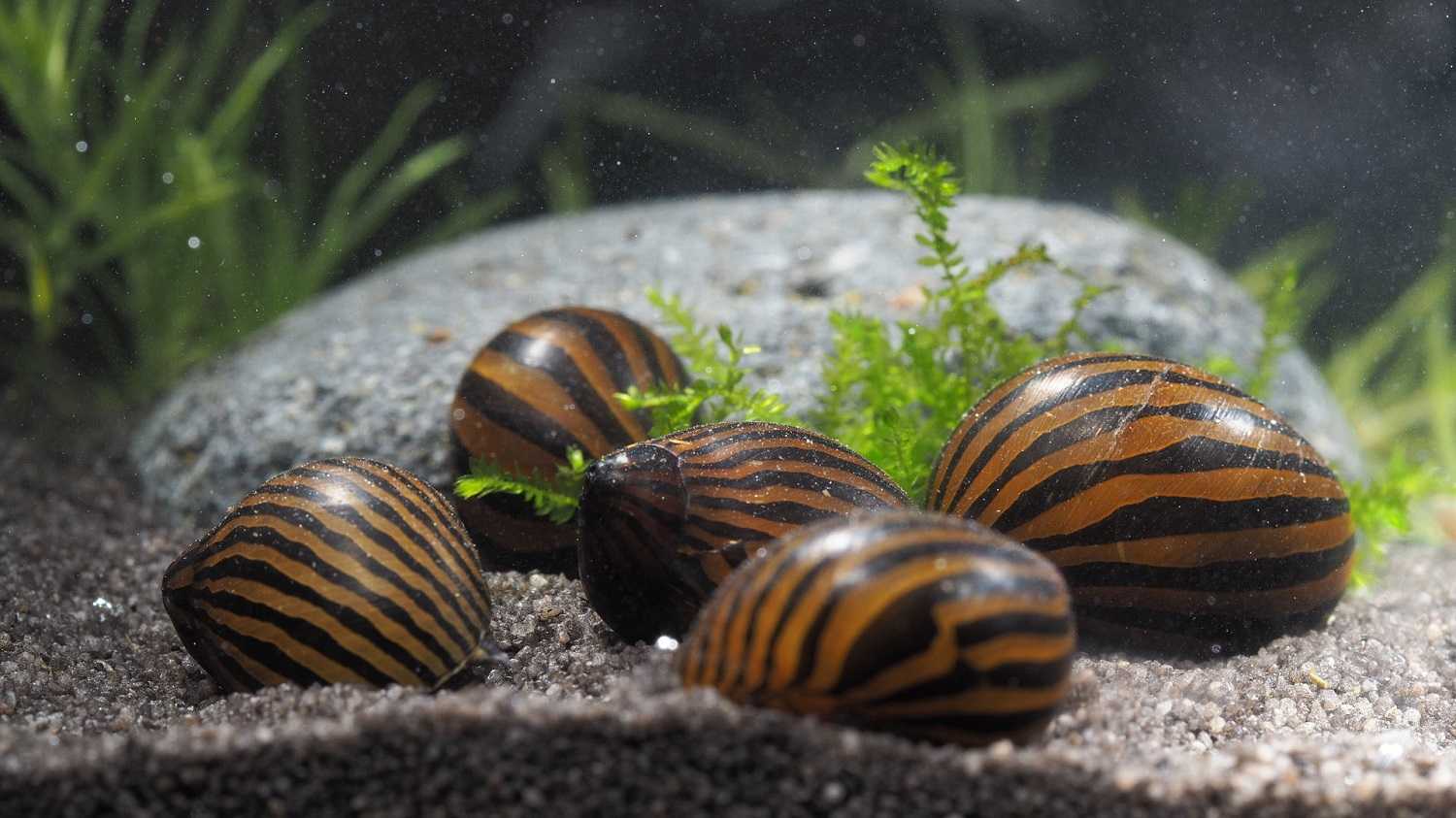 Отличительная черта неретины – ее симпатичная раковина с золотисто-черными полосами, размеры которой не превышают 2-2,5 см. Важный момент – эти улитки предпочитают слегка подсоленную воду, что особенно актуально во время размножения. Яйца неретины могут развиваться только в такой воде.