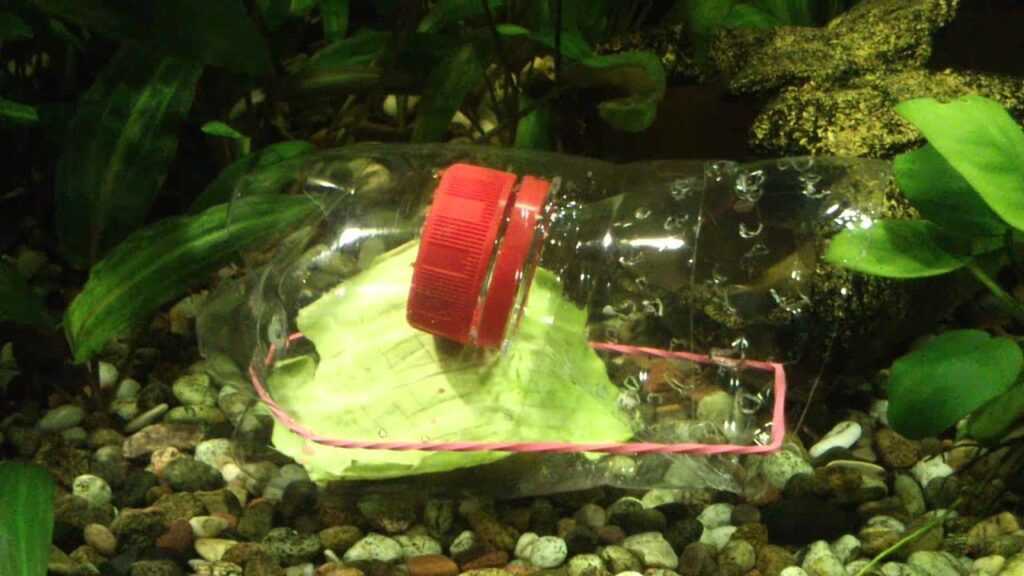- Сделать ловушку. Вот как раз для катушек этот способ подходит отлично. Нужно просто прикрепить к леске лист салата и опустить вечером в аквариум. Ночью включите свет, и вы увидите, что улиток у вас в аквариуме как звезд в галактике. Лист нужно вытащить и поступить с уловом как вам заблагорассудится. Конечно, всех брюхоногов вы не изживете, но если регулярно повторять эту операцию, то таким образом можно регулировать численность. Ловушка для аквариумных улиток может быть сделана своими руками и в виде пластиковой бутылки, стакана и т.д., наполненного улиточьей едой.