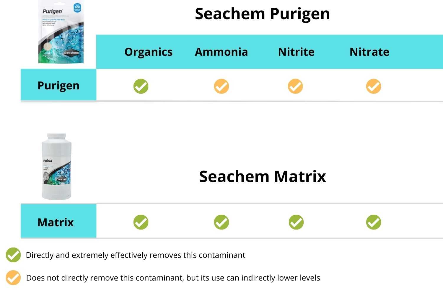 Typically, the Seachem Matrix excels in aggressively targetting a wide range of impurities in different types of aquarium setups. In contrast, the Purigen is highly efficient in targeting waste and discoloration while also maintaining the absorption of organic molecules without removing other types of contaminants.