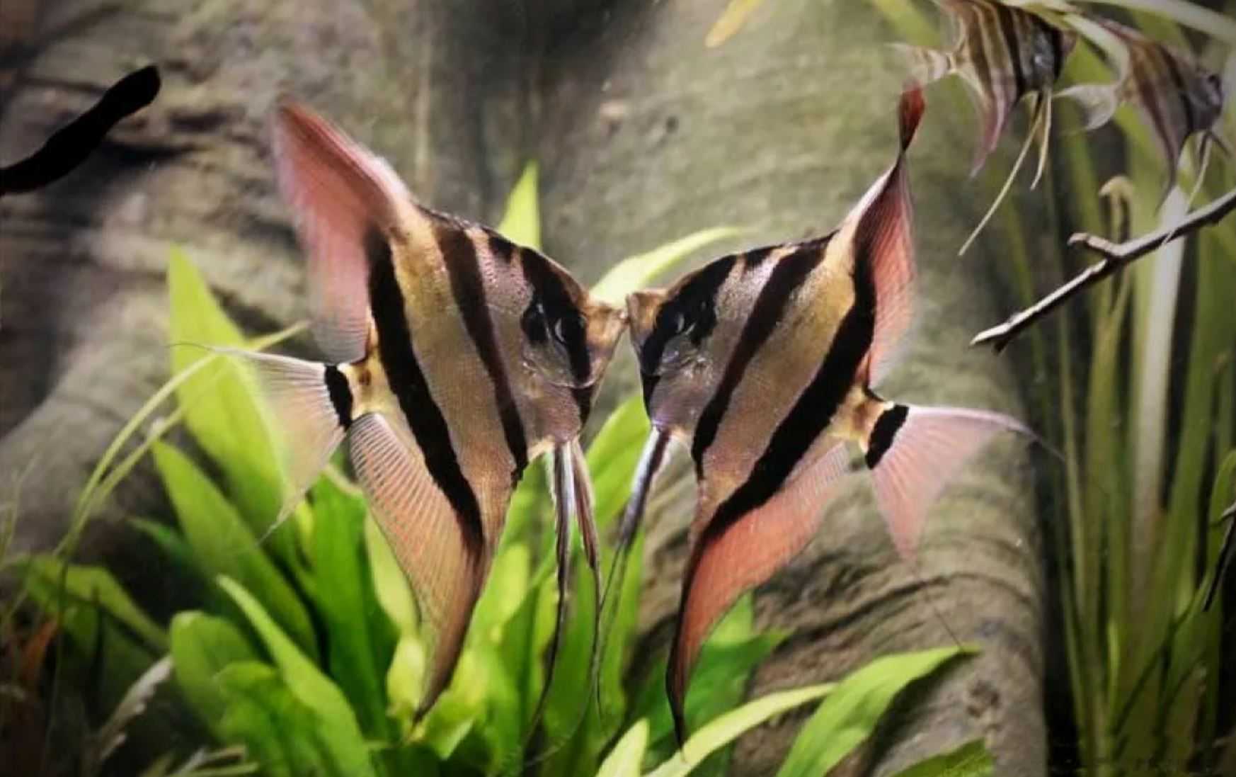 Очень эффектно в аквариуме смотрятся розовые скалярии, яркий цвет которых смогут уравновесить подселенные к ним черные скалярии.