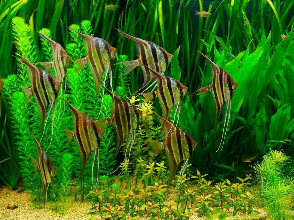 В аквариуме со скаляриями желательно иметь множество водных растений. В их зарослях рыбы чувствуют себя защищенными. Здесь можно высаживать любые растения с широкими и длинными листьями. Подойдут валлиснерия, эхинодорусы, криптокорины и им подобные. Нельзя допускать чрезмерного зарастания аквариума. Рыбам необходимо место для плавания.