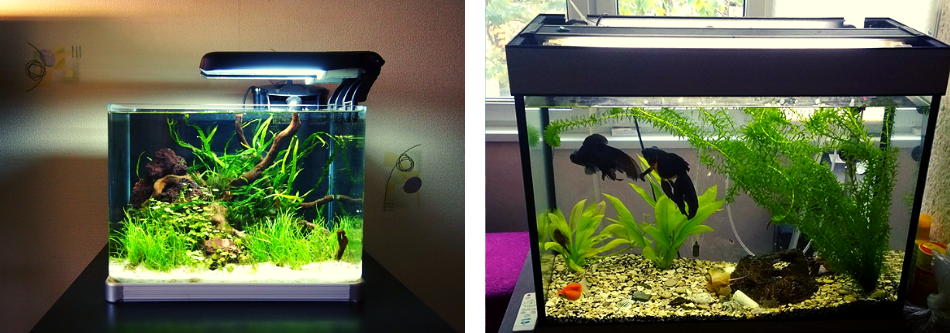 Аквариумы объёмом от 5 до 10 литров имеют второе название Nano. Это крохотные резервуары, в которых обычно содержится 1 или 2 маленькие рыбки в симбиозе с парой водных растений.