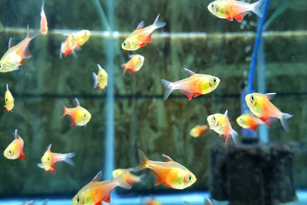 - Для рыбок длиной до 6 см (пецилий, миноров, тернеций) минимальная плотность посадки составляет 2 л на 1 особь.