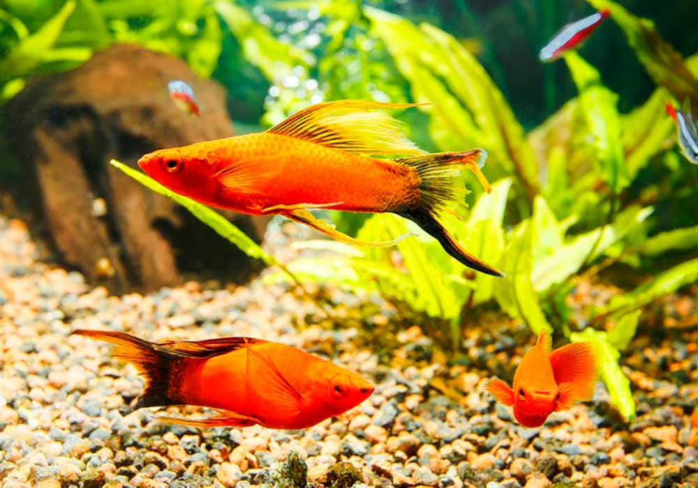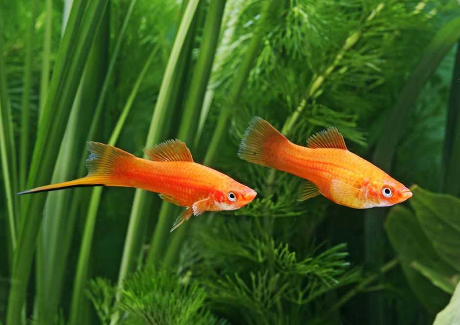 Меченосцы — тропические рыбки, им нужна более теплая вода, чем золотым.