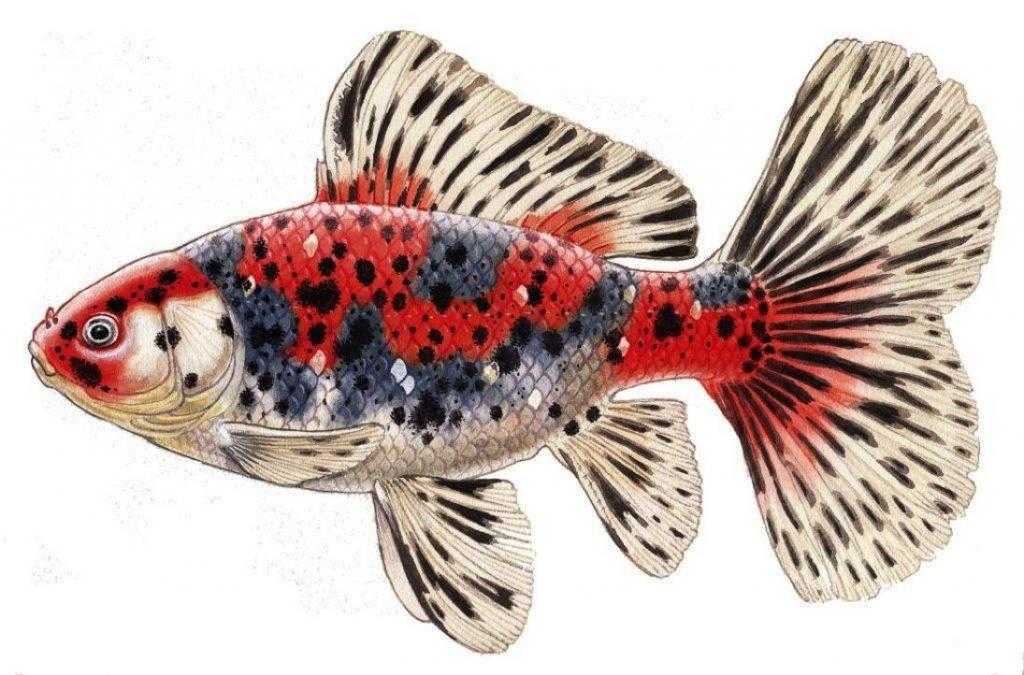 От обыкновенной золотой рыбки и «Кометы», рыбка «Шубункин» главным образом отличается пятнистой многоцветной окраской. rwtate