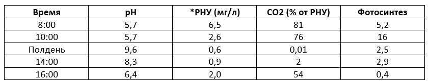 Во многих природных водоемах pH меняется в зависимости от концентрации CO2. Ночью CO2 накапливается из-за разложения органики. Когда встает солнце и солнечный свет освещает растения, они в процессе фотосинтеза интенсивно этот углекислый газ поглощают. Суточное колебание pH в пределах одного пункта – обычное дело для природных водоемов. Интенсивнее всего изменения происходят с рассвета до полудня. Эти колебания не влияют ни на рыб, ни на растения.