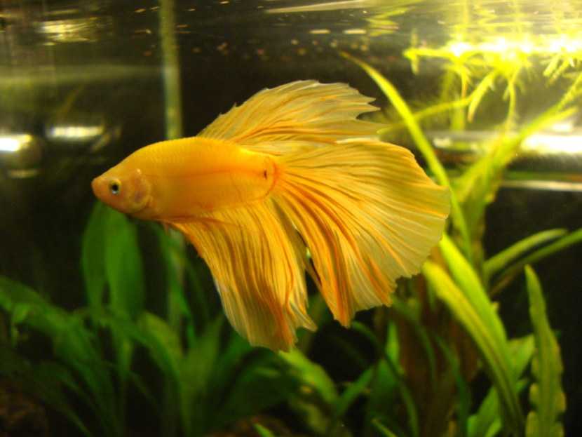 уж очень похожа на классическую золотую рыбку «вуалехвост». Она имеет настолько длинные плавники, что они иногда тянутся по дну аквариумов.