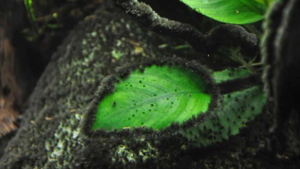 Черный налёт на растениях может появиться в результате заражения так называемой «черной бородой». Это темно-коричневая водоросль, которой покрываются листовые пластины растений, грунт, стекла и декорации. Тонкие нити темного оттенка на растениях выглядит не эстетично. Черная борода может привести к поражению растения, в результате чего оно быстро увядает.