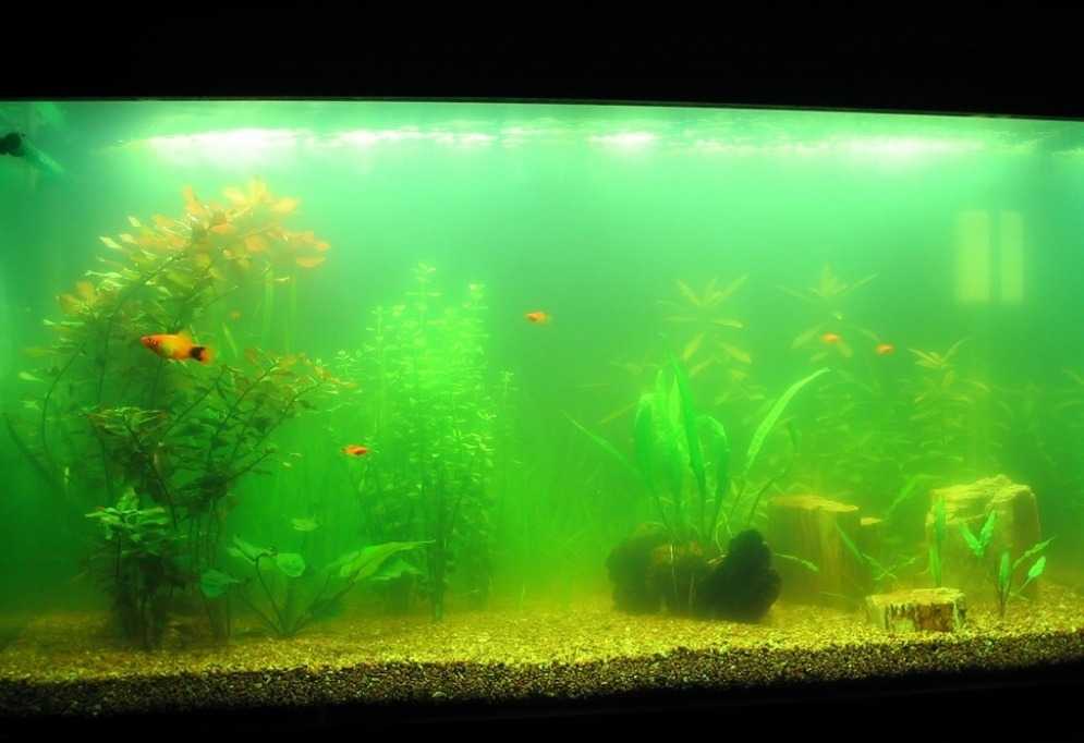 - Преобладание естественного освещения – если аквариум стоит на подоконнике или в той части жилого помещения, где имеются прямые солнечные лучи, зеленый налет на стенках и помутнения воды не избежать.