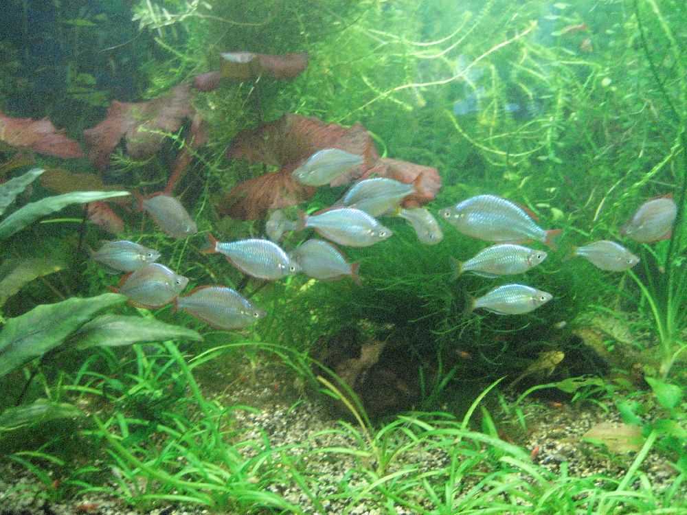 - Яркость радужного блеска, игра неожиданно вспыхивающих цветов у этих рыбок сильно зависит от их состояния и настроения: в незнакомых условиях, при стрессовых ситуациях сияние меркнет и меланотении становятся неприметными тусклыми тенями, скрывающимися в водных зарослях.
