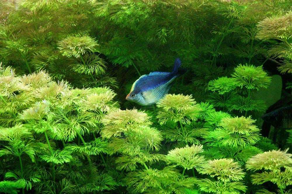 - мелколистные водные растения, прижатые камешками ко дну — риччия, яванский мох.