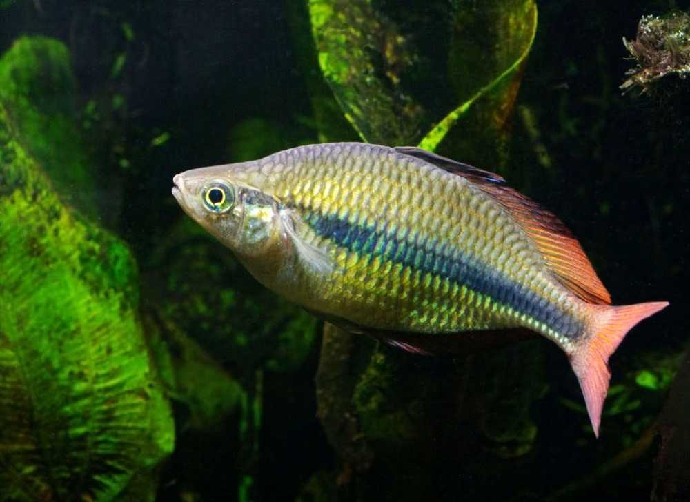 Melanotaenia trifasciata. Рыбка длиной до 12 см (самцы крупнее самок), цвет на боках может варьироваться от голубовато-зеленого до коричневато-золотистого.