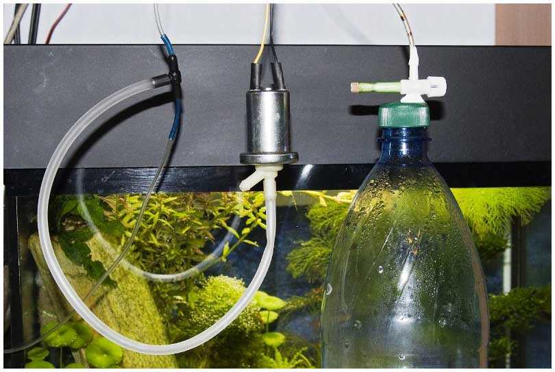 Можно распылять углекислоту с помощью изготовленного своими руками простого и экономичного устройства. В пустую пластиковую бутылку нужно засыпать сахар и дрожжи. В крышке необходимо просверлить отверстие и расположить шланг так, чтобы он располагался внутри аквариума, тогда как сама установка будет находиться вне воды. На край шланга необходимо надеть распылитель для лучшей подачи газа.
