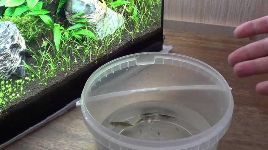 - Часть воды из покупной емкости вылейте в раковину, а вместо нее налейте воду из аквариума;
