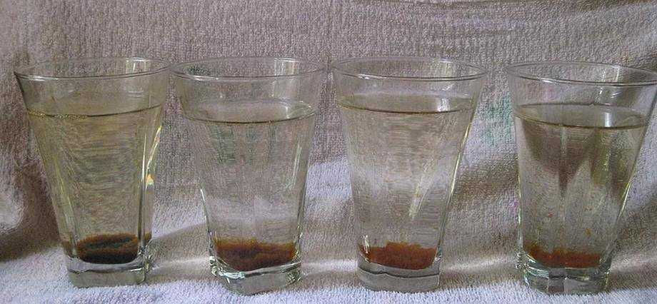 Все эти три разновидности железа ведут себя в воде по-разному. Например, если жидкость изначально бесцветная, а по прошествии времени на дне сосуда образуется осадок коричневого цвета, значит, имеет место присутствие Fe2. Когда из крана бежит желтая вода, а спустя какое-то время еще и появляется осадок, значит, присутствует Fe3.