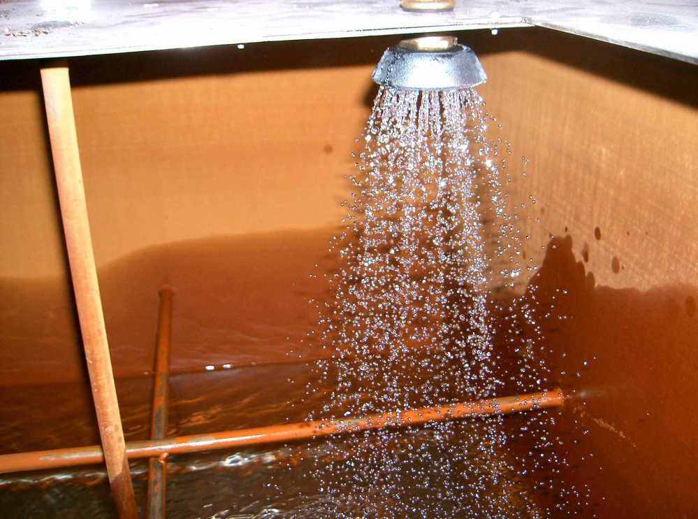 В процессе распыления вода будет контактировать с кислородом, что приведет к реакции окисления растворенного железа и выпадению ржавого осадка на дно емкости.