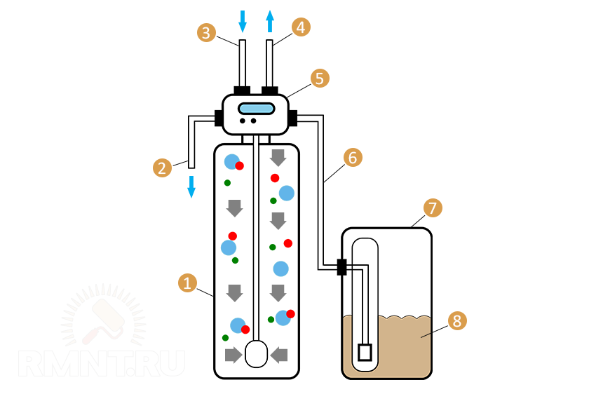 Схема работы ионообменного фильтра: 1 — корпус фильтра; 2 — дренаж; 3 — исходная вода; 4 — вода в дом; 5 — блок управления; 6 — поступление солевого раствора при регенерации; 7 — солевой бак; 8 — уровень соли