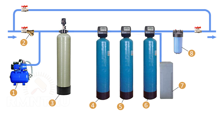 1 — насосная станция; 2 — фильтр-грязевик; 3 — аэрационная колонна; 4 — безреагентный обезжелезиватель; 5 — сорбционный фильтр; 6 — умягчитель; 7 — соляной бак; 8 — фильтр тонкой очистки