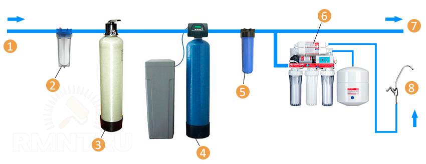 1 — вода из скважины; 2 — механическая очистка; 3 — вытеснение растворённых в воде газов; 4 — удаление железа и солей; 5 — тонкая угольная очистка; 6 — фильтр с обратным осмосом; 7 — чистая техническая вода; 8 — питьевая вода