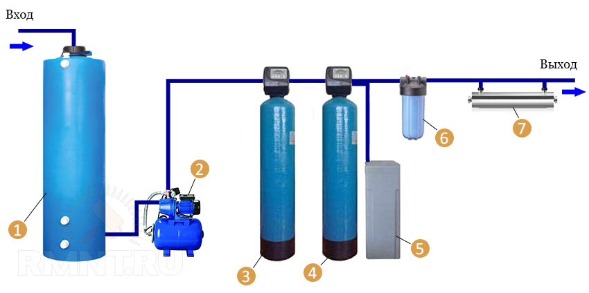 1 — окислительный бак; 2 — повысительная станция; 3 — обезжелезиватель; 4 — умягчитель; 5 — соляной бак; 6 — фильтр тонкой очистки; 7 — ультрафиолетовая лампа