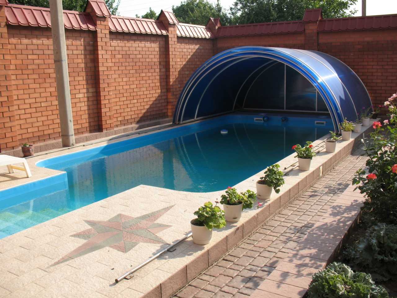 - Раздвижные варианты с подвижными рамными секциями из поликарбоната, накрывающие зеркало бассейна своеобразным колпаком;