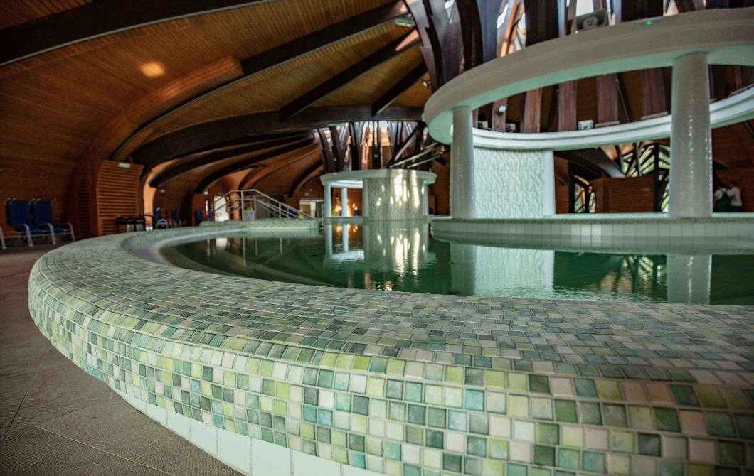 Для зоны входа, ступеней и пола на небольшой глубине была выбрана плитка Green Bali Stone испанской фирмы Mainzu. Этот материал также имеет нескользящую поверхность, а размер одной плитки небольшой – 20 на 20 см, что позволит избежать деформации от давления воды. Цена составляет 3500 руб./м².