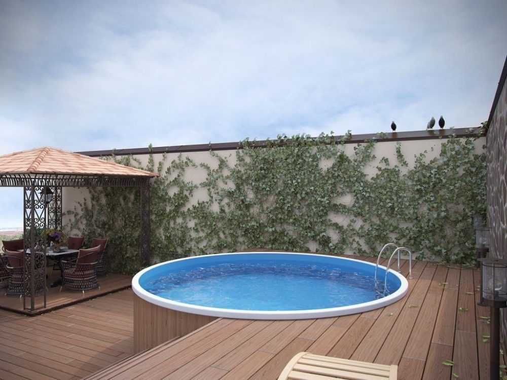 Стационарный каркасный бассейн, окруженный специальным деревянным помостом